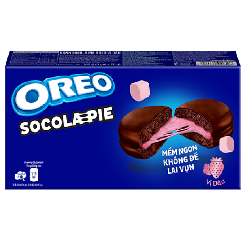 Cadbury Oreo Chocolate Pie Strawberry 168g combines the beloved taste of Oreo biscuits with a luscious strawberry twist, all wrapped in smooth Cadbury chocolate. Each bite features a fluffy marshmallow center infused with sweet strawberry flavor, perfectly balanced by the classic crunch of Oreo biscuits. The outer layer of rich Cadbury chocolate completes the experience, creating a delightful harmony of fruity sweetness, creaminess, and crunch.