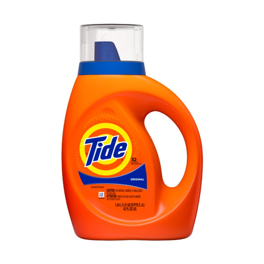 Tide Liquid Original delivers the trusted clean you know and love with a refreshing, long-lasting scent. The 42oz (1.24L) bottle provides up to 32 loads of laundry, offering powerful stain removal in a convenient size. Its concentrated formula keeps clothes looking bright, colors vibrant, and whites spotless while leaving them with the classic Tide Original freshness. Designed to work in both High Efficiency (HE) and standard washing machines, Tide makes every wash effective, even in cold water.